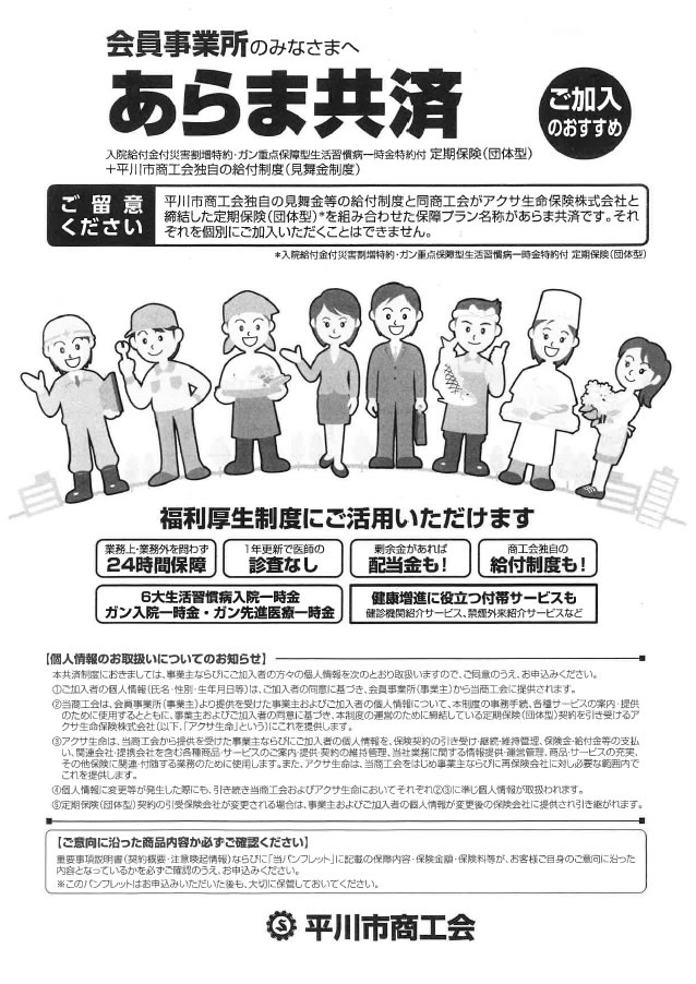 | 平川市商工会独自の見舞金等の給付制度と同商工会がアクサ生命保険株式会社と締結した定期保険(団体型)*を組み合わせた保障プラン名称があらま共済です。 それぞれを個別にご加入いただくことはできません。 ※入院給付金付災害割増特約・がん重点保障型生活習慣病一時金特約付 定期保険(団体型) |